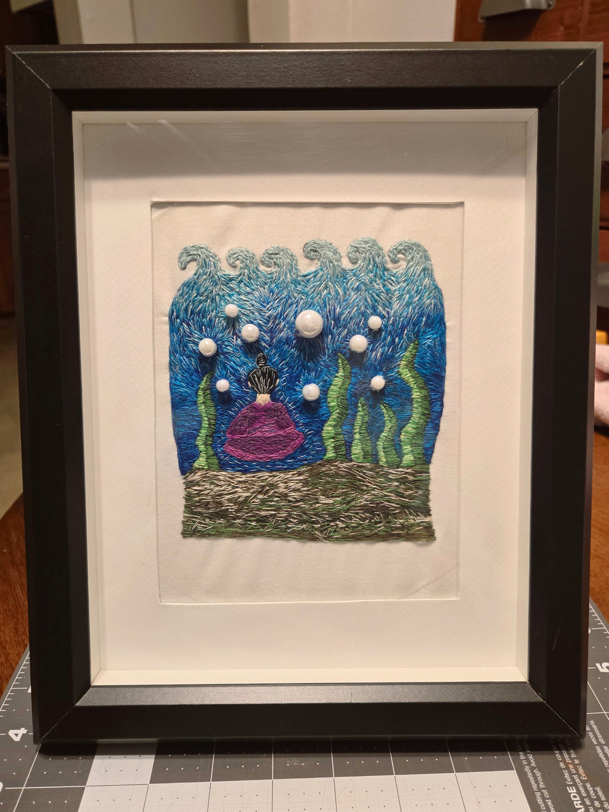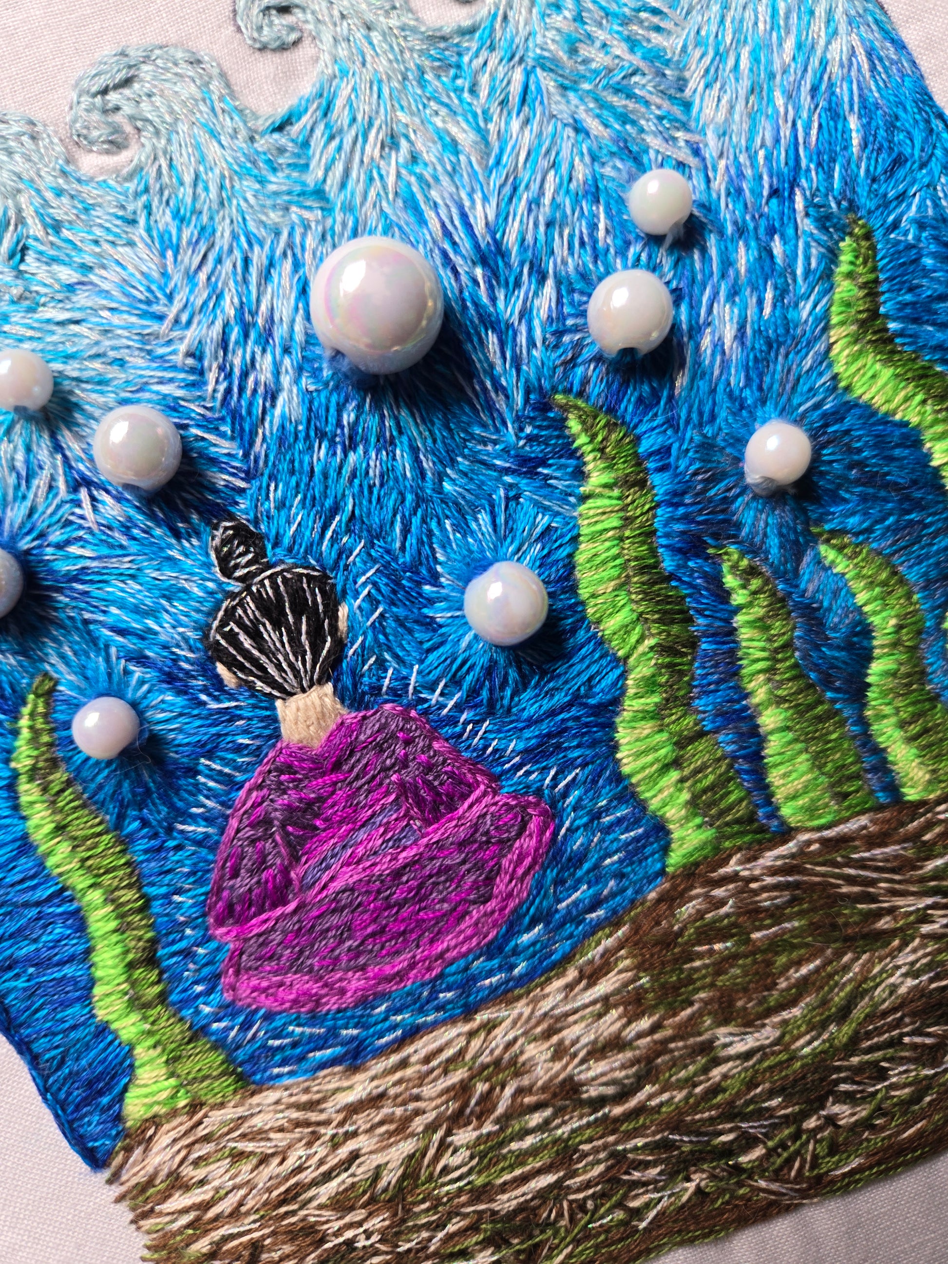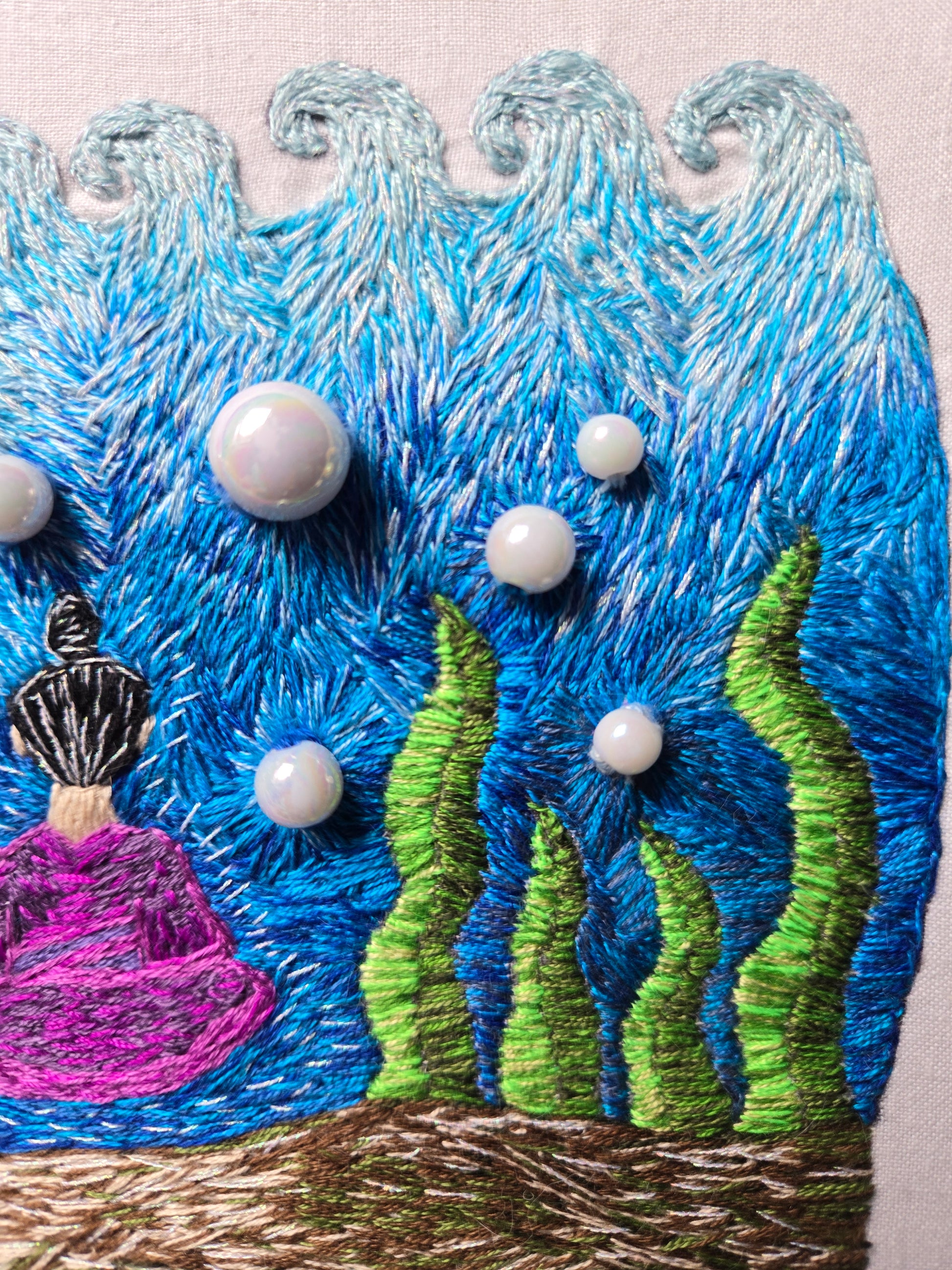 Inspired by my own meditation practice, this embroidery visualizes the tranquil state of inner peace I find within. A solitary magenta figure sits calmly on a textured seabed, embraced by stitched blue and teal waters with gentle waves, symbolizing the stillness found amidst the flow of thoughts and emotions, while swaying green seaweed suggests the observed movements of the mind, and scattered pearl beads represent moments of clarity experienced i this quiet, self-made underwater sanctuary.