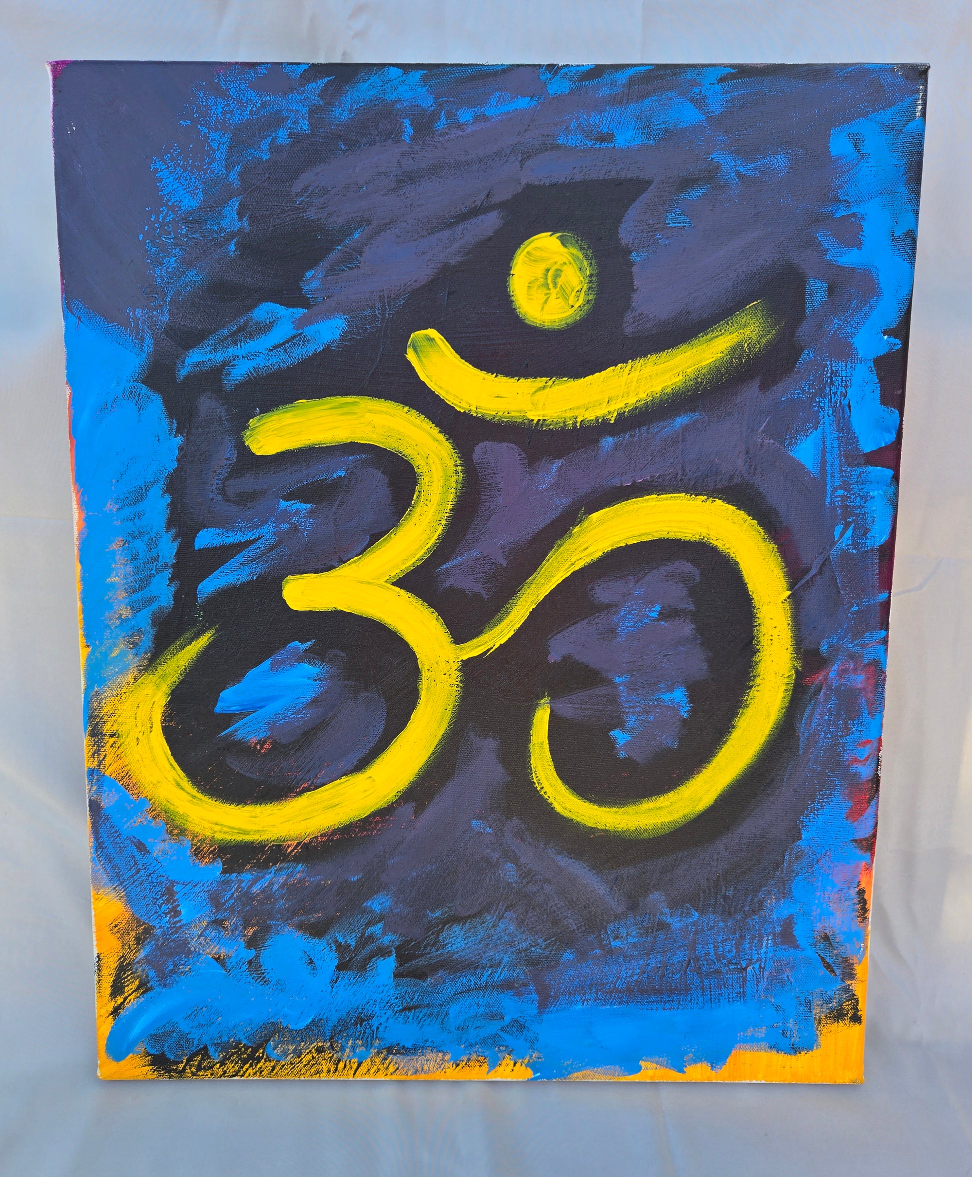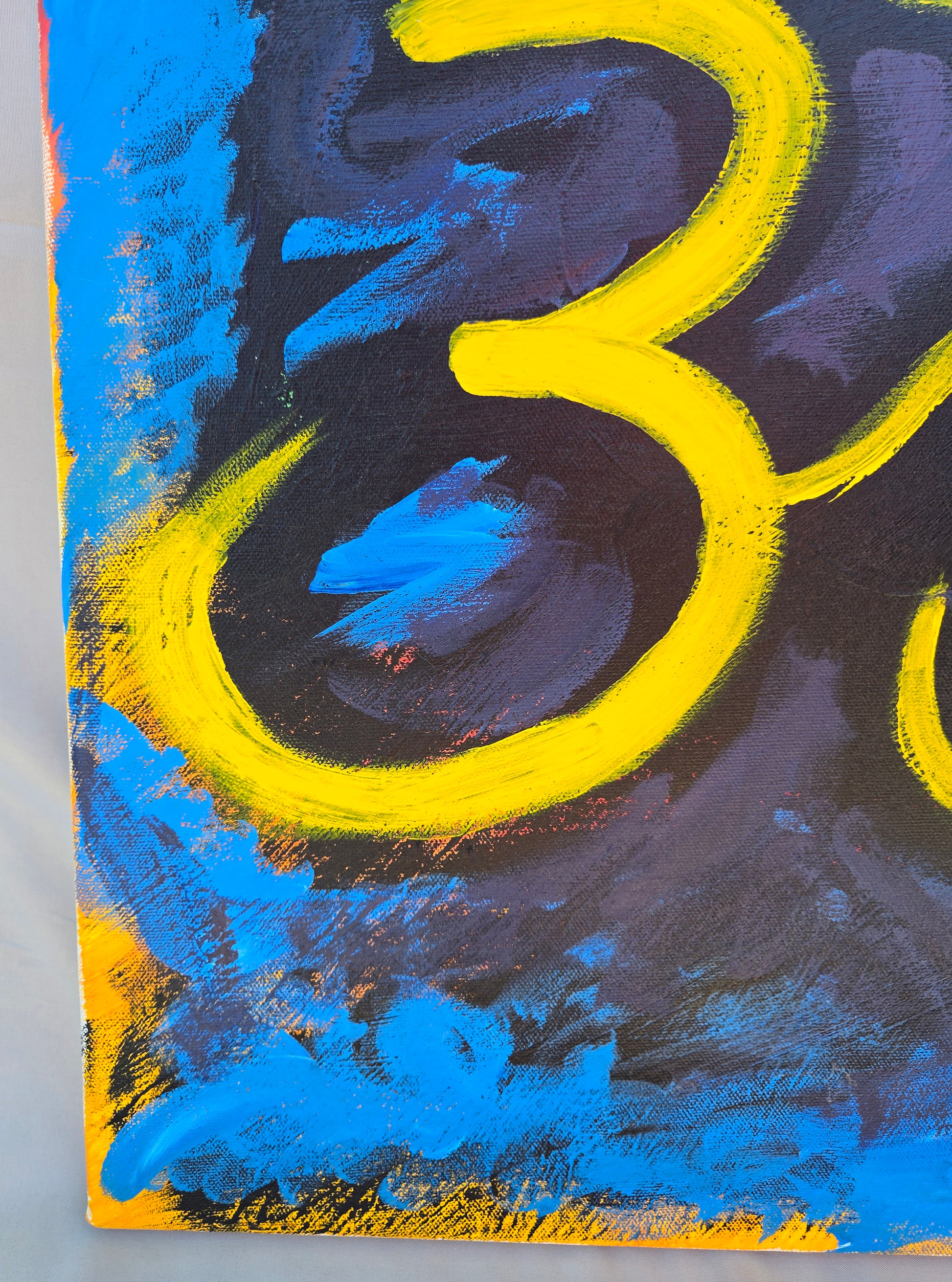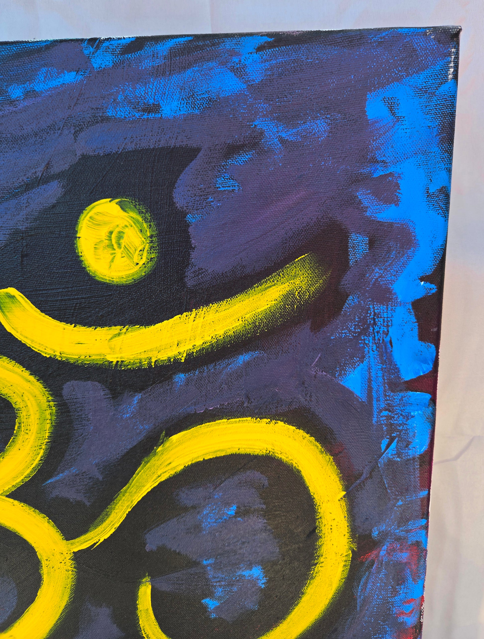This vibrant acrylic painting showcases the sacred Hindu symbol Om in bold yellow, contrasted against a dark background. Energetic blue and purple brushstrokes surround the symbol, creating a dynamic and textured composition. The abstract style of the painting suggests a connection between the Om and the universal energy it represents.