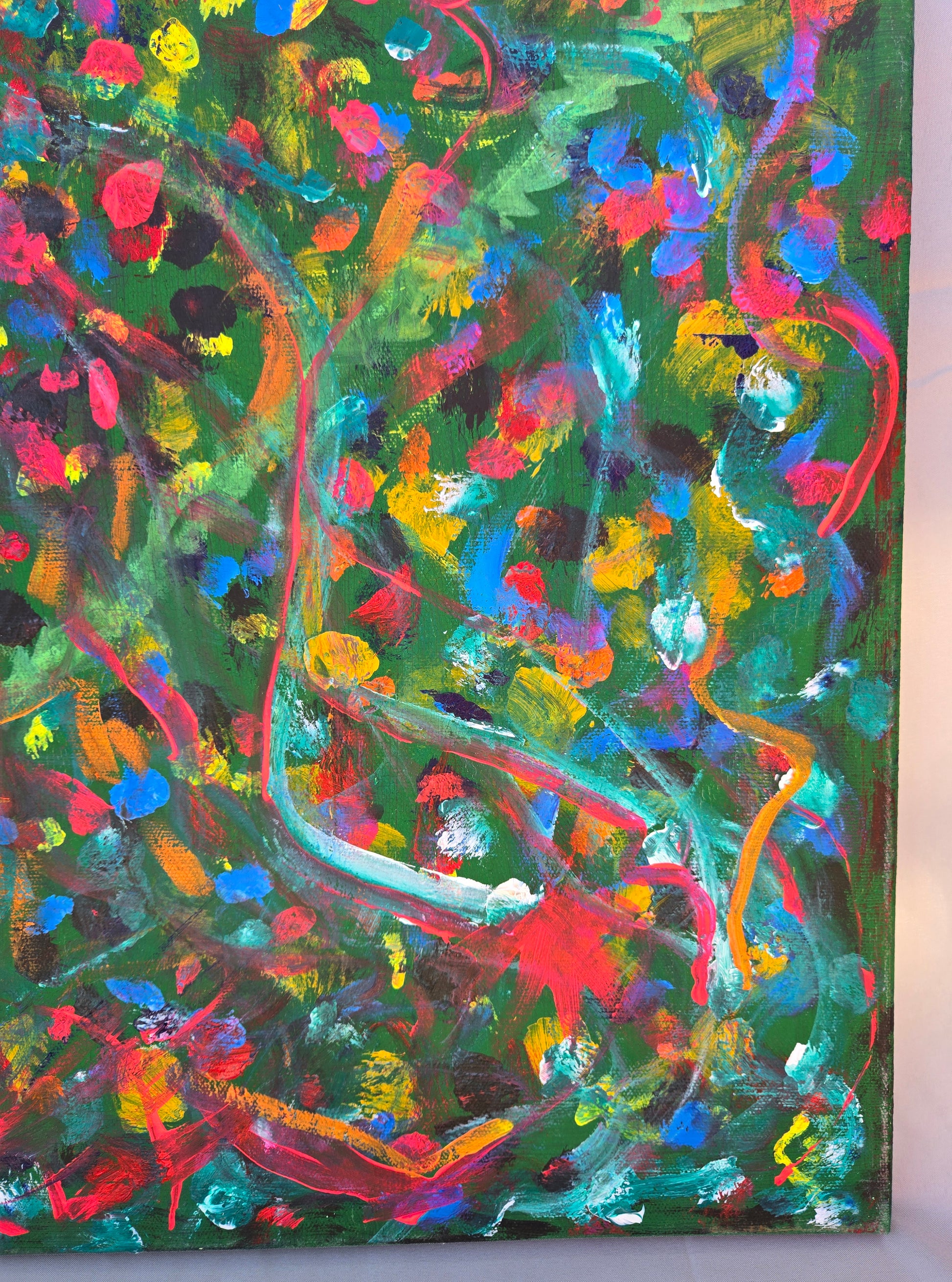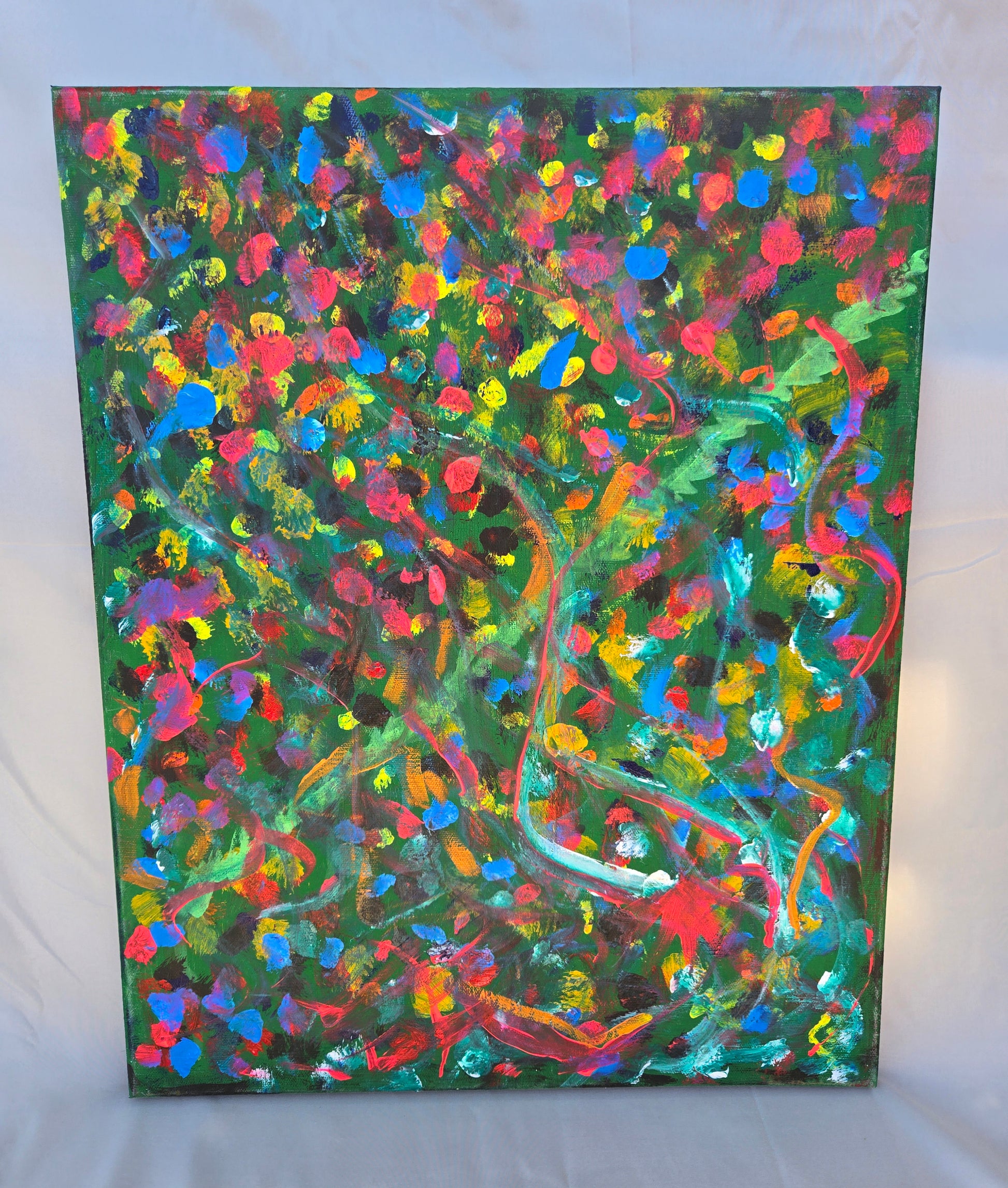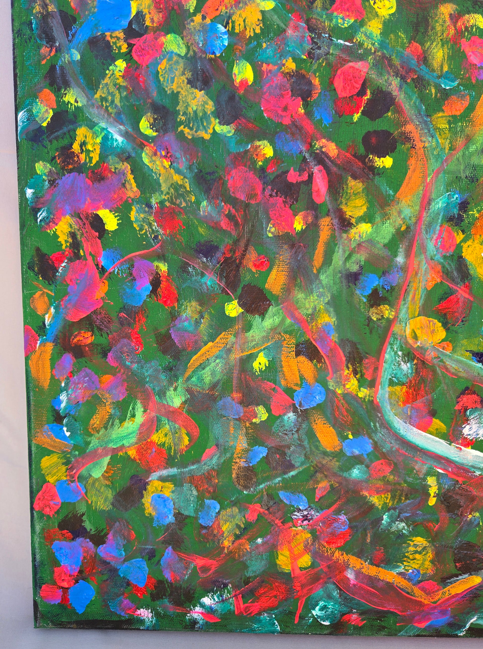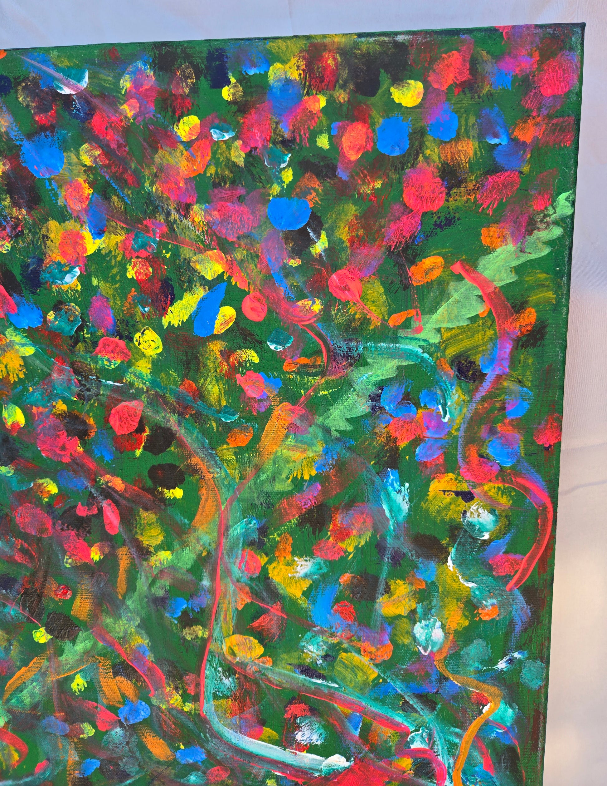 Experience the unbridled joy and creativity of this vibrant acrylic painting through its bold and expressive use of color. The canvas is a chaotic yet harmonious blend of vivid pinks, reds, blues, yellows, and greens, with loose brushstrokes and gestural movements that add to the raw and energetic feel of the piece.