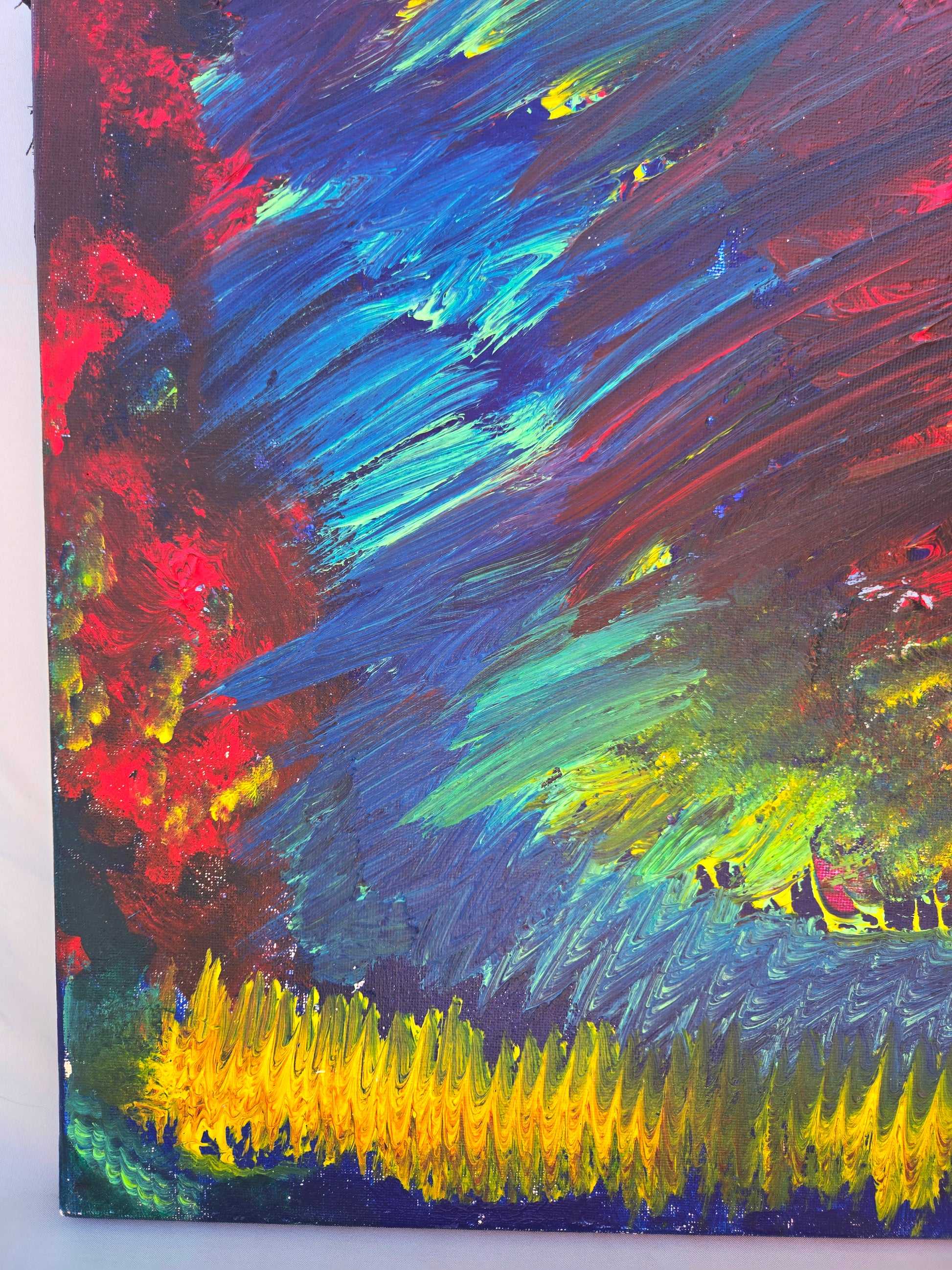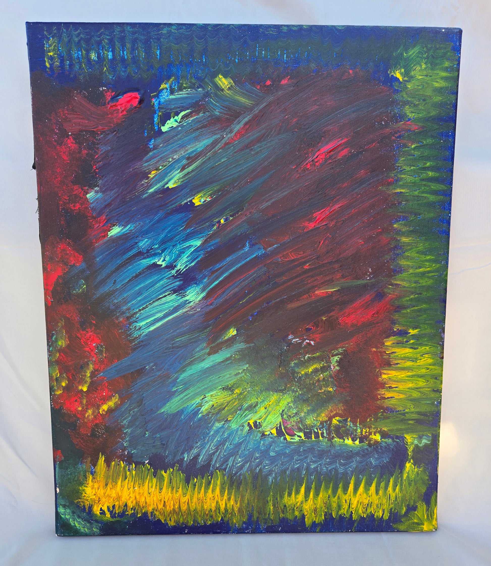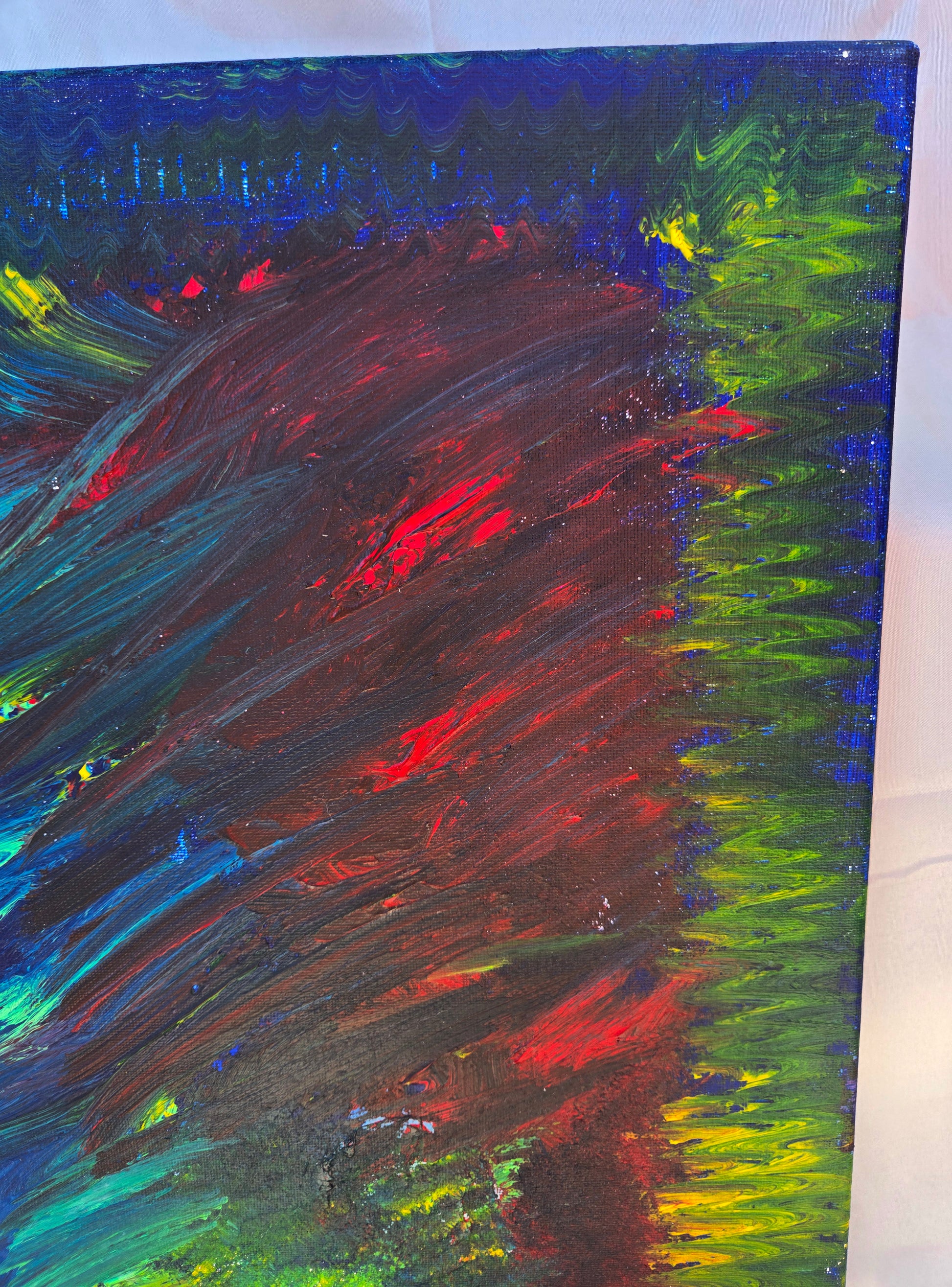 This lively oil painting features a bold use of color, with vibrant reds, blues, yellows, and greens creating a dynamic and expressive composition. The colors blend and bleed into each other, evoking a sense of chaos and motion. Against the dark background, the brighter hues stand out, emphasizing the intense interplay of colors and leaving a lasting emotional impact.
