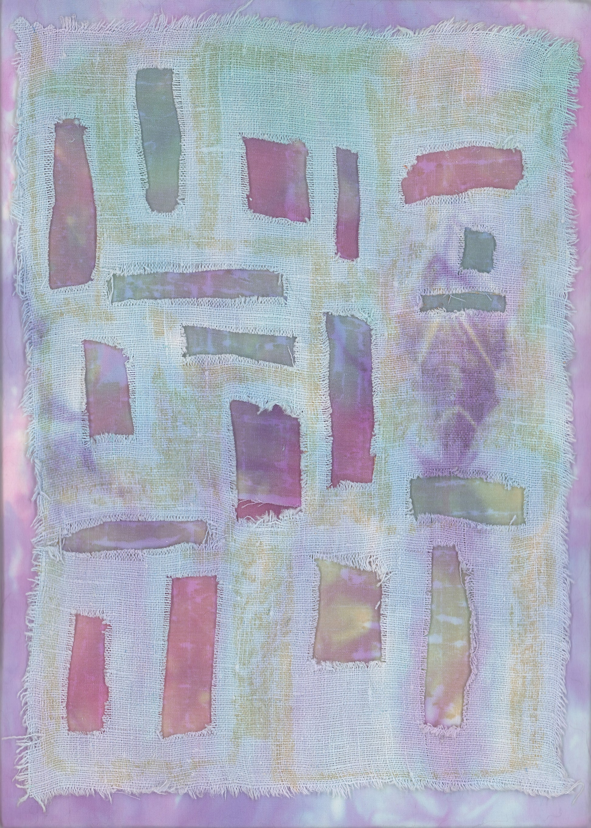 This captivating fabric art piece invites the viewer to explore its layered textures and vibrant colors. Ash has skillfully combined various fabrics, creating a dynamic interplay of light and shadow. The soft, ethereal hues of lavender and pink create a dreamy atmosphere, while the bold, geometric shapes add a sense of structure and order. The raw edges and visible stitching add a touch of rustic charm, highlighting the handmade nature of the work.